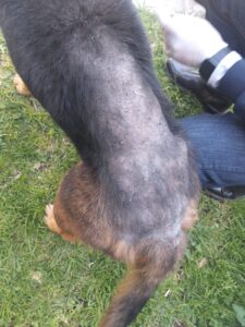 En el sitio, fue encontrada una canina con evidentes señales de omisión de atención médica, pues presentaba infestación de pulgas, daño severo en su cuerpo y con signos de encontrarse en celo.